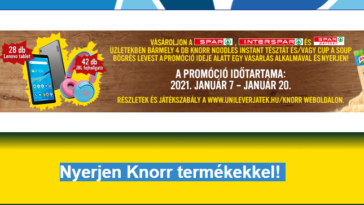 SPAR, InsterSPAR – Nyerj Knorr termékekkel! A játék január 20-ig tart. „Vásároljon a SPAR Magyarország Kereskedelmi Kft., az INTERSPAR és a SPAR partnerek magyarországi üzleteiben vagy az áruház online webshopján keresztül egy vásárlás alkalmával 4 db Knorr instant tésztát és/vagy Cup a soup bögrés levest 2021. január 7. és 2021. január 20. között és az Öné […] Megnézem