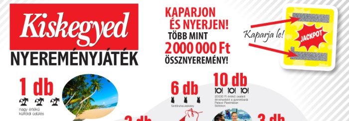 Kiskegyed nyereményjáték: Kaparj és nyerj – több mint 2 000 000 Ft össznyeremény! Ilyen egyszerűen nyerhet! 1. Kaparja le a Kiskegyed címlapján lévő matrica kaparófelületét! 2. A kaparóréteg alatt három ikont talál, amennyiben a három megegyezik, ön nyert! Csak az egy sorban lévő három darab ikon nyertes, két különböző kaparóréteg ikonjai nem adhatók össze. Példa: nem nyertes az […] Megnézem