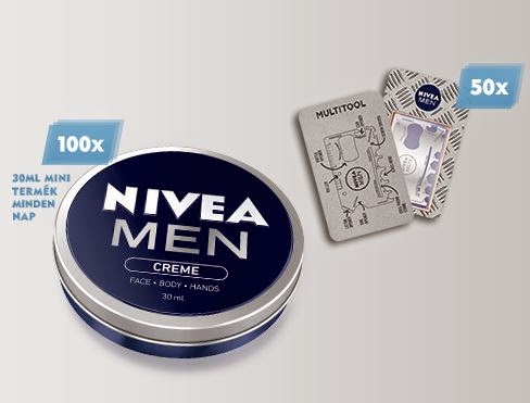 Minden nap az első 100 regisztráló 30ml-es mini terméket kap a NIVEA MEN CREME-ből és azt ingyenesen tesztelheti. Srácok mire vártok? Hölgyek, hadd küldjünk egy termékmintát a partnereteknek, férjeteknek, apukátoknak, fiatoknak!