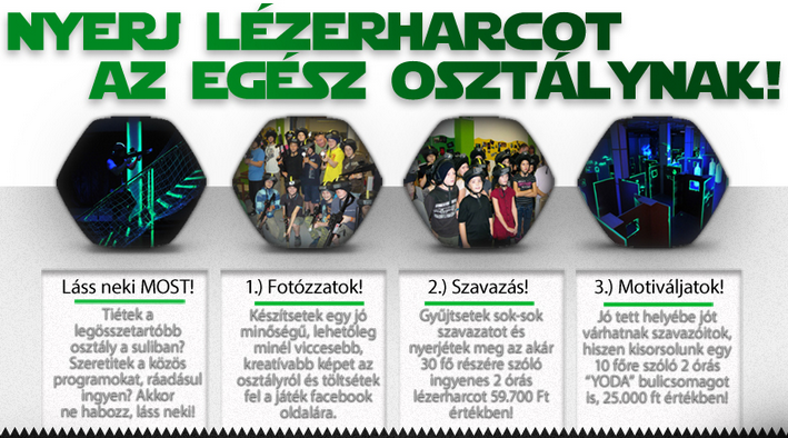 A szavazók között egy 2 órás bulicsomagot sorsolunk, 10 főre! Nyerj Lézerharcot az Osztálynak!Indul fotópályázatunk! A Tiéd a legösszetartóbb osztály a suliban?Szerettek közös programokat szervezni? Nevezz be! Csak annyit kell tenned, hogy feltöltesz egy osztályképet,és indulhat a szavazás! Ha Te gyűjtöd össze a legtöbb szavazatot, egy 2 óráslézerharcot nyersz az egész osztálynak. Szavazni is megéri! A szavazók között kisorsolunk egy 10 fős,2 órára szóló lézerharc bulicsomagot.